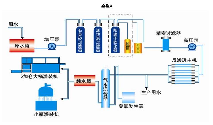 原水→原水箱→原水泵→多介質過濾器(石英砂過濾器)→活性炭過濾器→軟水處理器→精密過濾器→高壓泵→一級反滲透(RO)裝置→純凈水箱→高壓泵→二級反滲透→紫外線裝置→用水點