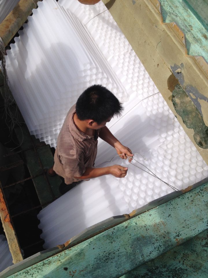 1、打開斜管包裝袋,將第一片斜管平放于地面,取第二片斜管置于第一片之上,檢查斜管切口60°角方向,并呈六角蜂窩狀,無誤后開始焊接;