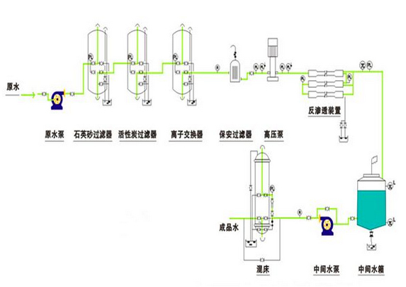 原水箱→原水泵→石英砂過濾器→活性炭過濾器→離子交換器→精密(保安)過濾器→反滲透高壓泵→反滲透→純水箱→純水泵→混床→DI離子水
