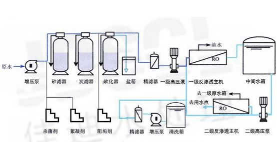 二級反滲透對一級反滲透產水進行拋光處理,增加PH值有利提高水質
